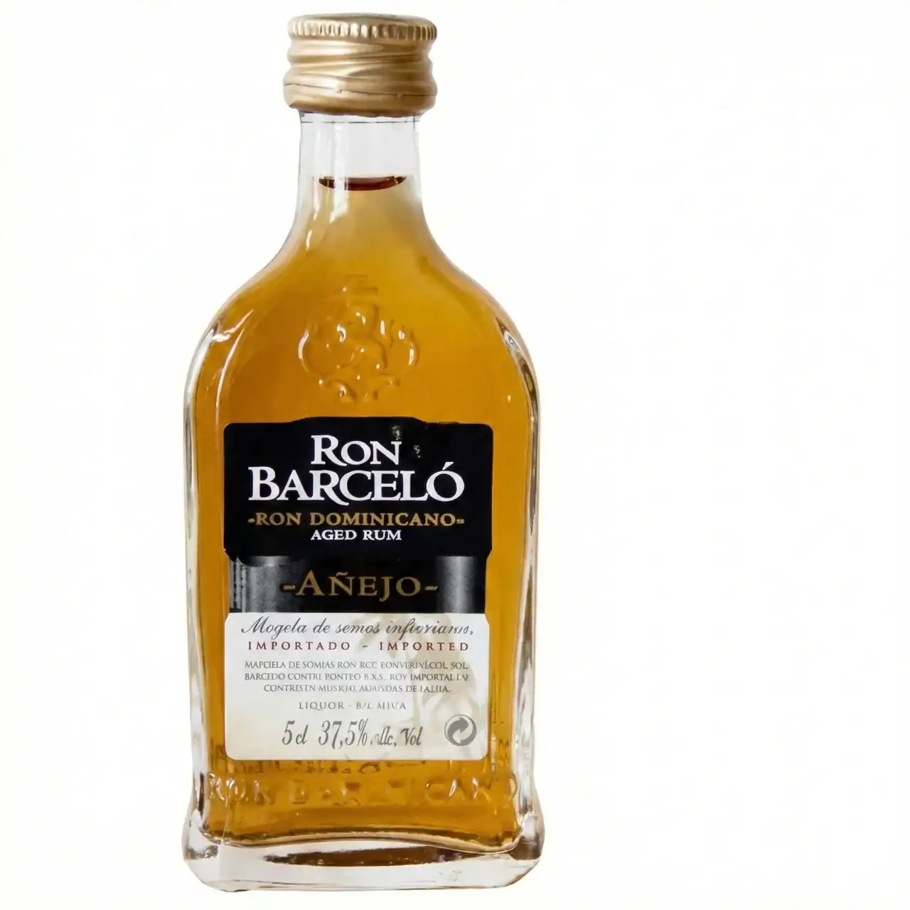 La botella característica conserva en miniatura el diseño distintivo de Barceló, con sus líneas elegantes y la etiqueta que refleja la tradición y prestigio de la marca. El vidrio transparente permite apreciar el atractivo color ámbar dorado del ron añejo.